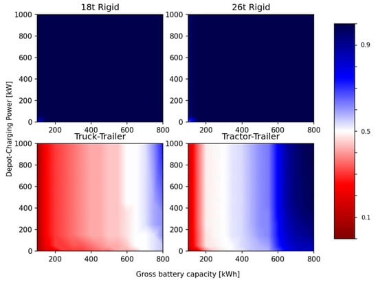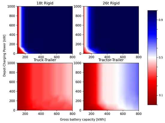 BET feasibility per truck class—scenario 1. Variations for battery capacity [kWh] and depot-charging power [kW]; color bar indicates technical feasibility from 0% to 100%—own illustration.