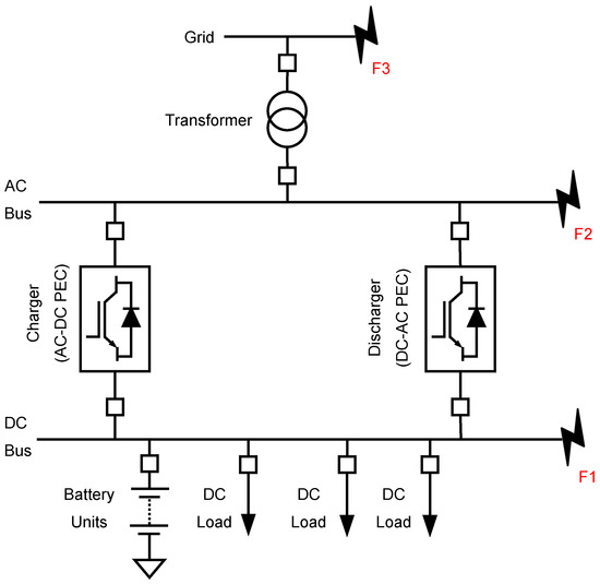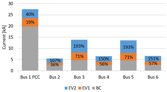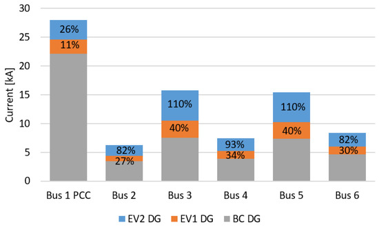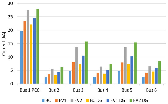 Figure 6. It can be seen that the incorporation of EVs increases the short-circuit levels. In scenarios EV1 and EV2, where DG is disconnected, there is an increase in short-circuit levels at all buses compared to the base case (BC). Note that of this group of scenarios, EV2 presents the highest short-circuit levels. When considering DG connected to the grid (scenarios EV1 DG and EV2 DG), there is also an increase in short-circuit levels at all buses compared to the corresponding base case with DG (scenario BC DG). Note that scenario EV2 DG presents the highest short-circuit levels. Note that the highest increments in short-circuit levels take place when DG is connected to the network. Finally, it was observed that Bus 1 PCC features the highest magnitudes of short-circuit, which is due to its proximity to the main grid.
