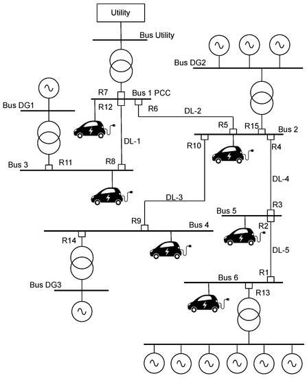 Figure 7, it can be seen that EVs impose a considerable increase in short-circuit levels when there is no DG connected to the network. Scenario EV1, which considers 5 EVs, presents a smaller increase in short-circuit levels compared to scenario EV2, which considers 15 EVs. Note that Bus 1 PCC presents the lowest short-circuit percentage increase in both scenarios: 19% in EV1 and 40 % in EV2. This is due to the high short-circuit level of the bus, which is related to its proximity to the main grid. Buses 3 and 5 present the highest short-circuit percentage increase: 71% for scenario EV1 and 193 % scenario EV2. According to these results, it can be inferred that the most affected protections are those at Buses 3 and 5, due to their large short-circuit level variations.