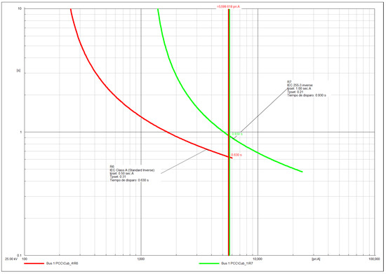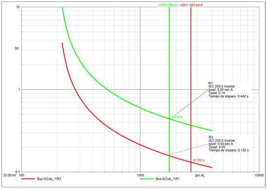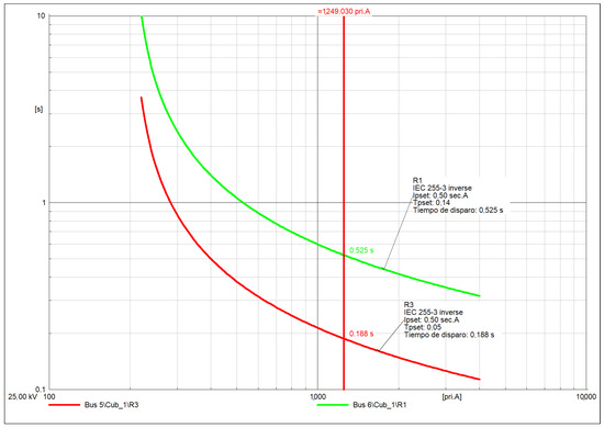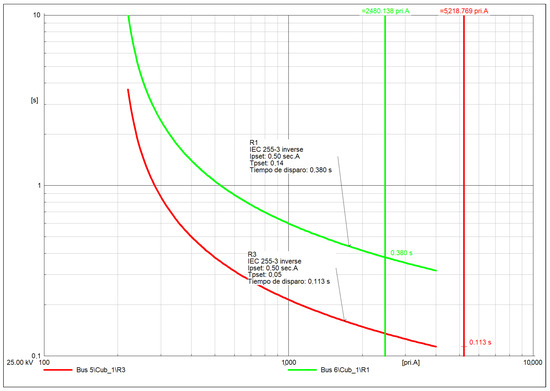 2), some of the cases are validated using the coordination curves. The first case to be analyzed is when there is a fault on line DL-4. In this case, relay R3 is the main relay and R1 is the backup relay. In the BC scenario, R3 does not see the fault current because the contributions to this current come from the main network; consequently, in this scenario, it is not necessary to verify the coordination of these relays. Therefore, when analyzing scenarios EV1 and EV2, there are selectivity problems. In scenario BC DG, it is necessary to coordinate relays R3 and R1 (see