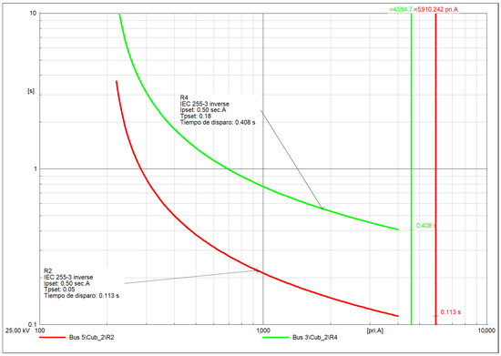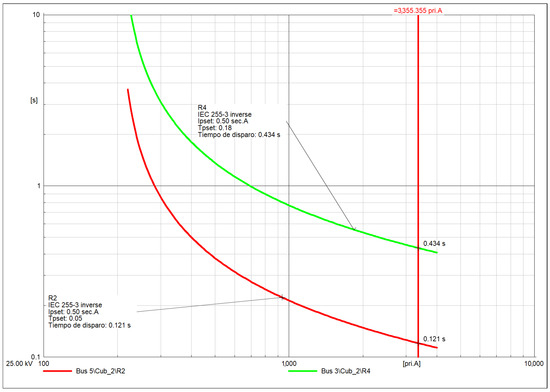 The third case to be analyzed is when there is a fault on line DL-5. In this case, relay R2 is the main relay, and R4 is the backup relay. In the BC scenario, relays R2 and R4 present selectivity (see