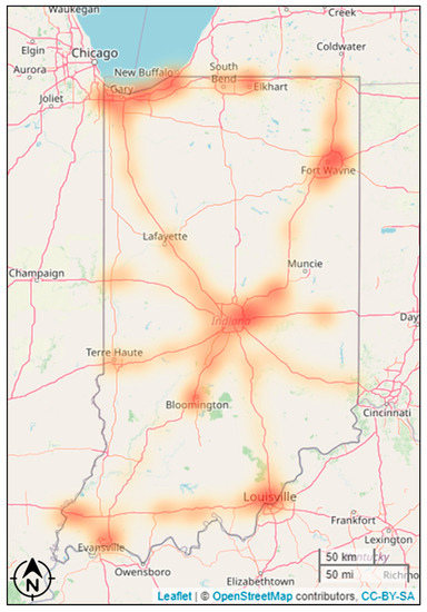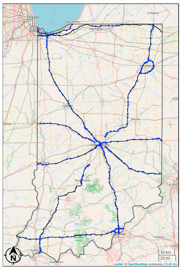 Figure 10a shows a statewide map of the current state of fast charging infrastructure in Indiana. The charging stations shown herein, made available via the National Renewable Energy Laboratory’s (NREL) Alternative Fuel Station API [25], represent those with the SAE J1772, SAE J1772 Combined Charging System (CCS) Combo 1 and CHAdeMO fast charging connectors only. Blue circles represent locations of existing fast charging stations, while red lines represent fast charging deserts on an interstate route.