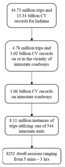 CV data obtained from a third-party vendor at 3-s frequency and 3 m geolocation accuracy was utilized for this study. Each CV data record represents a CV waypoint with the following attached attributes—an anonymized trajectory identifier, speed, heading, geolocation, timestamp, ignition status, and a vehicle classification code allowing the categorization of the waypoint as belonging to an ICEV, hybrid vehicle (HV) or EV. Each month, Indiana ingests nearly 13 billion CV records representing over 44 million unique trips of sampled CVs. This dataset represents on average about 4.3% of traffic volumes on interstates and 5% of volumes on non-interstate roads [22]. Of these 44 million trips for the month of May 2022, 4.78 million trips were observed to have occurred within the nominally 5-mile spatial buffer around the 9 interstate routes analyzed in this study, representing about 3 billion CV trajectory waypoints. In total, 1.06 billion records out of the above dataset were observed directly on interstate roadways, which enabled the exit utilization and dwell session computations described by the sections that follow in greater detail. A flowchart representation highlighting the scale of CV data used in this analysis is depicted by Figure 2. While the data used in this study mainly represents ICEVs, exit usage and dwell activity patterns obtained from the same may be used as a surrogate for future EV travel as the composition of current ICEV heavy traffic slowly transitions towards majority EVs in the near future.