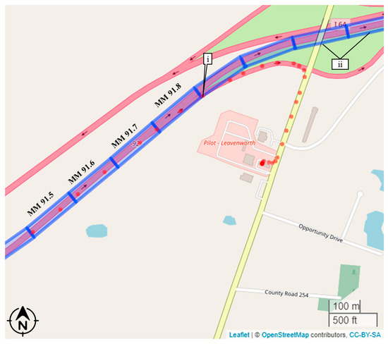 Given a comprehensive dataset of CV waypoints for the state of Indiana, the first step to reduce the waypoint data down to exit-level metrics is analyzing every single CV trajectory to determine points of ingress and egress off of an interstate route. The methodology utilized by this paper involves a set of polygons, each 0.1 mile in length, along the direction of travel of a roadway pointed to by callout ii in Figure 3. A CV trajectory’s overlap is determined with this set of polygons, enabling the detection of the point of departure for a journey when it leaves the interstate. This linearly referenced set of polygons allows a near-exact detection of the mile marker, and thus the corresponding exit, at which a journey joined or left the interstate route. For the sample journey shown by the red waypoints in Figure 3, callout i shows the point at which the journey departs the interstate. Hence, using this methodology for the sample CV trip shown in Figure 3, it can be classified as having exited off of interstate 64 (I-64) at Exit 92.