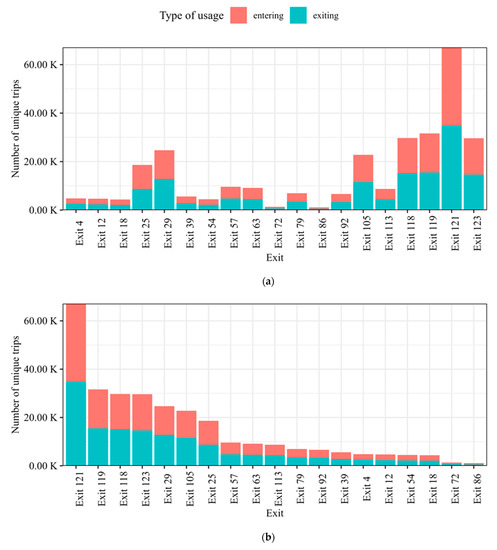 Exit Utilization for 19 exits on Interstate 64 (May 2022). (a) Exits ordered geographically. (b) Exits ordered by observed usage.