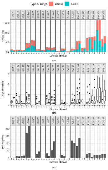 Exit Utilization and Observed Dwell Activity for Interstate 64 (May 2022). (a) Exit Utilization by Direction of Travel. (b) Dwell Times observed across 19 exits. (c) Number of Dwell Sessions at each exit.