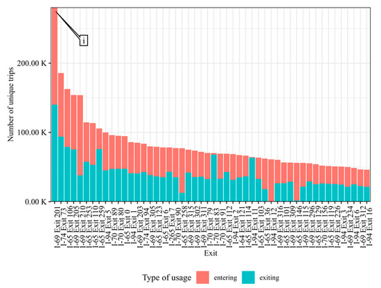 These data analytics procedures scale quite well. A systemwide analysis of all 544 exits along 9 interstates was carried out using CV data for Indiana for the month of May 2022. The results of the exit utilization analysis are shown in Figure 6 as a pareto sorted chart of the top 50 exits with the highest CV activity. Trips utilizing each exit are categorized by those joining the interstate (entering) or those leaving the interstate route (exiting). Callout i points to the most utilized exit in the state, Exit 201 on Interstate 69, which is, unsurprisingly, a major interchange connecting Interstate 69 with Interstate 465, the beltway around the city of Indianapolis witnessing heavy commuter traffic on a daily basis.