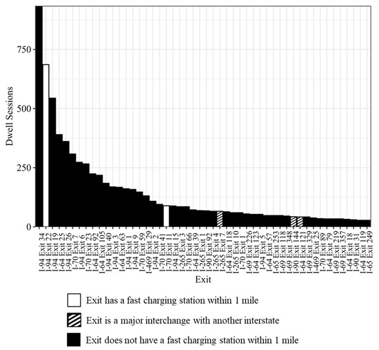 A pareto sorted representation showing the top 50 exits in the study location ranked by the number of dwell sessions observed at each exit is shown in Figure 8. Hollow white columns indicate exits that currently have a fast charging station within one mile of the interstate, solid black columns indicate exits without any fast charging stations within a one-mile radius of the exit, while hatched columns represent those exits forming a major interchange with another interstate route. This graphic depicts how a majority of the top 50 utilized exits in the state, as of this analysis, are not sufficiently serviced by fast charging infrastructure except for Exit 22 on I-94.