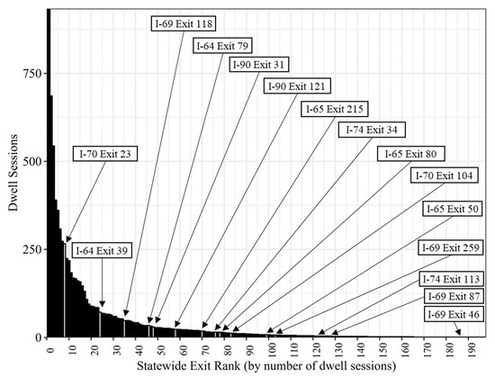 A tabular summary of the top three exits for each analyzed route seeing the highest number of dwell sessions is shown in Table 1, along with the number of dwell sessions (NDS) and mean dwell time (MDT) in hours corresponding to each exit. Exit 34 on Interstate 94 shows the highest number of dwell sessions overall (934), while Exit 249 on Interstate 65 shows the highest overall mean dwell time (1.32 h). Exit 34 on I-94 is home to multiple lodging options, restaurants, convenience and department stores within a mile pointing to possible reasoning for it accounting for the highest number of dwell sessions. Exit 249 on I-65 has multiple long-term dwell options including dining and shopping within a mile possibly accounting for the highest overall MDT among all exits.