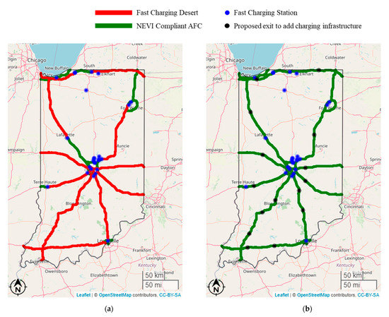 Indiana Interstate Fast Charging Deserts. (a) Current state of fast charging infrastructure in Indiana. (b) Charging deserts addressed by potential addition of infrastructure at exits proposed in Table 2.