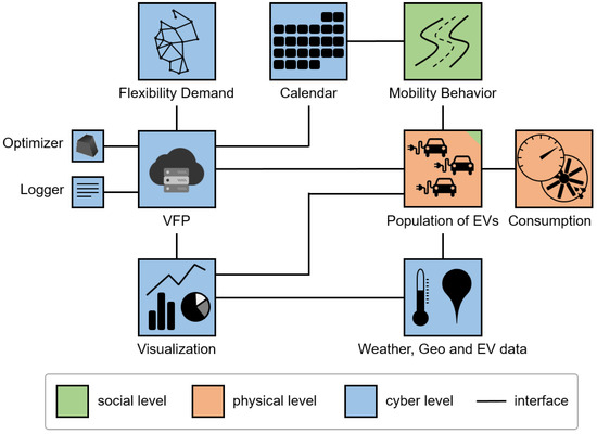 On the cyber layer, we modeled the cloud-based IT system that is in charge of smart charging control. The VFP connects to the chargers, aggregates the data and combines them with different third party data integration, such as vehicle telematics, weather or geographic data. It is connected to an optimizer that can use different smart charging strategies and algorithms [12] to realize the smart charging application. The model includes a visualization component for fast prototyping and experimentation.