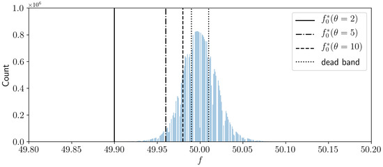 With a VPP of bidirectional chargers only, we can operate symmetrically around according to Equation (1). This means that the VPP is idle at (=50 Hz). It charges in the upper half of the frequency spectrum and discharges in the lower half. As the distribution is mostly symmetric, we also roughly need to discharge half of the time.
