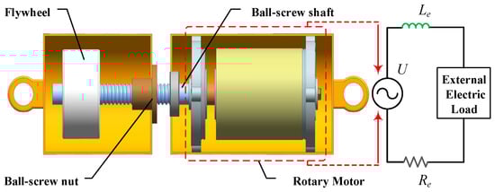 A mechatronic inerter is considered in this paper, which is formed by coupling a ball-screw inerter with a rotary motor. Its structural diagram is shown in Figure 1. The relative linear motion of the two ends of the mechanical inerter can be converted into the rotary motion of the motor. The inductor, resistor and capacitor in the electrical network at the outer end of the rotary motor can equivalently simulate the spring, damper, and inerter in the mechanical network structure.