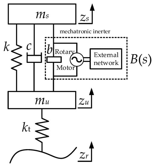 where k, kt, and c are spring stiffness, tire stiffness, and the damping coefficient, respectively, ms and mu are the sprung mass and the unsprung mass, respectively. zs, zu and zr are the vertical displacements of the sprung mass, the unsprung mass, and road roughness, respectively, and Zs, Zu and Zr are their Laplace transforms, respectively. B(s) is the impedance expression of the mechatronic inerter, which is shown as follows [17]: