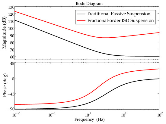 Compared with the Bode diagram of the traditional passive suspension, Figure 7 shows the Bode diagram of vehicle mechatronic ISD suspension applying the optimized fractional-order electrical network structure.