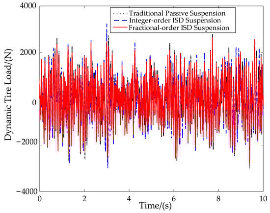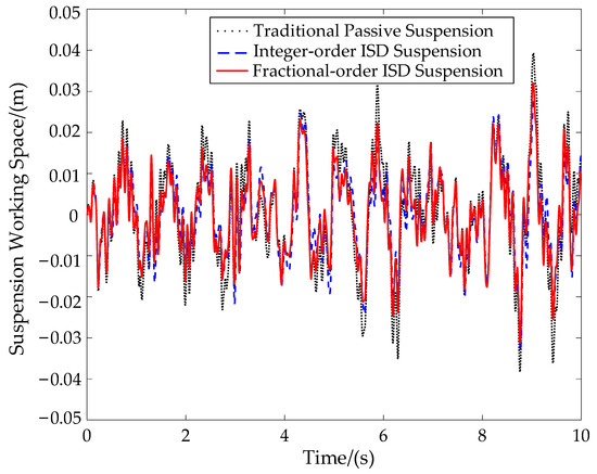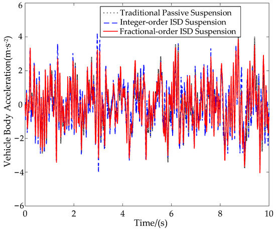 The optimization adopts multi-objective optimization, and the final optimization result is the best case of comprehensive improvement. From the data point of view, the RMS value of suspension working space has the best effect, and the other two indexes have also been improved. It can be seen that, compared with the traditional passive suspension, the RMS values of the vehicle body acceleration of the integral-order ISD suspension and the fractional-order ISD suspension are reduced by 3.44% and 4.12%, respectively. The RMS values of the suspension working space of the two suspensions are reduced by 22.31% and 23.08%, respectively. Furthermore, the RMS values of the dynamic tire load of the two suspensions are reduced by 2.73% and 5.31%, respectively, showing the advantages of the designed fractional-order electric network structure. It shows that the vehicle mechatronic ISD suspension with optimized fractional-order electrical network structure can further improve the vibration isolation performance of the suspension system.