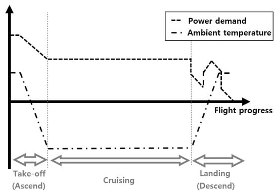 One of the possible solutions is to develop a low-mass battery thermal management system considering the profile of flight-specific power demand. In certain phases of flights where high power level is demanded, such as take-off and landing, batteries generate significant amounts of heat (Figure 1) [,]. This consequently increases the temperature of a battery. For lithium-ion batteries (LIB), the operational temperature range specified by battery manufacturers is typically between −20 °C and 60 °C []. Above this range, catastrophic failures such as thermal runaway represent considerable risks, while below this range battery performance is severely hindered because battery resistance increases at low temperatures (itself a catastrophic failure in the context of powered flight). Safety risks must be avoided at all costs, especially when the battery provides power to flying objects. Further, battery pack designers aim to maintain a far narrower operating window for optimised performance, typically around 15–35 °C []. A failure to operate in this optimal range results in accelerated degradation and reduced performance [,]. For example, Ramadass et al. showed that an LIB cycled 800 times at 50 °C lost 60% of its initial energy storage capacity. In the same test run at 55 °C, the LIB lost 70% of its initial energy storage capacity after just 600 cycles []. Uneven distribution of temperature across a single LIB or an entire battery pack leads to imbalances and high localised loading of current flow, again contributing towards accelerated degradation [,].