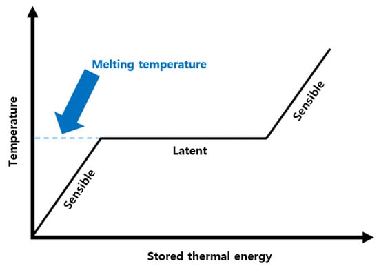 PCMs absorb, store and release heat by undergoing a phase change from solid to liquid states or vice versa. During this transition, energy is stored in the form of latent heat at a near constant temperature (the melting temperature of the PCM), as shown in Figure 2. This characteristic of PCMs is beneficial for systems that experience large fluctuations in both ambient temperature and the heat generated by systems, such as space vehicles and buildings in desert areas [,].