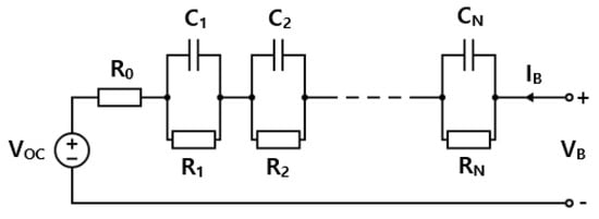 To model the dynamic behavior of a cell, the Thevenin equivalent circuit model (ECM) was adapted (Figure 3). This battery model was chosen over others such as electrochemical models due to its simplicity and low computational cost relative to the others []. The ECM of a cell is composed of several components: