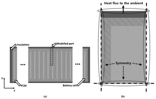 A battery pack refers to a system consisting of multiple cells and a BTMS. Assuming adiabatic boundary conditions on the top and bottom surfaces of the pack, the domain can be reduced to a 2D cross-sectional view, as can be seen in Figure 4a. In this work, the modeled cells are entirely enclosed by the PCM, creating a conductive heat transfer interface on each of the four modeled interfaces between cell and PCM. This optimises the surface area to volume ratio of the PCM in order to maximise the effectiveness for thermal management purposes []. Symmetrical boundaries allow the modelled domain to be further reduced to just one-quarter of the full cell and the corresponding adjacent PCM. It is assumed that heat transfer in the x-direction across the pack is negligible when compared to that in the y-direction (Figure 4a), i.e., there is no heat transfer from one cell to the adjacent cell. This is justifiable for large battery packs, as would be expected for use in regional flight applications.