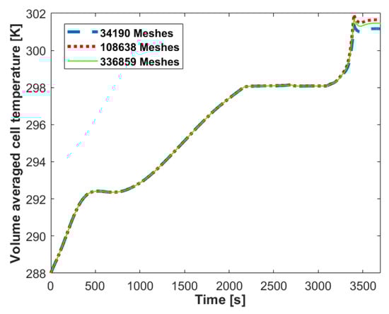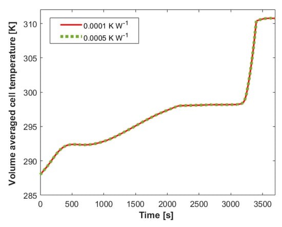 To find the temperature field, the heat transfer of the cell was modelled using the Three-Dimensional, Solid, and Implicit Unsteady models on STAR-CCM+. The energy source option was activated to include the battery internal heat generation rate using defined above. The ECM parameters were expressed in terms of SOC, assuming that parameter dependency on the cell temperature is insufficient to severely affect their quantities. This assumption is valid within the temperature ranges tested in the present study [,,]. Under this assumption, it is possible to eliminate a dimension of parameter determination that is necessary at every time step of the numerical simulation, making all ECM parameters functions of SOC alone. This significantly reduces the computational demand for the ECM within the CFD solver, enabling far greater resolution for the planned parametric study with four variables (thermal conductivity, latent heat of fusion, and battery pack initial and PCM melting temperatures).