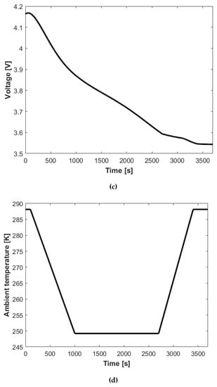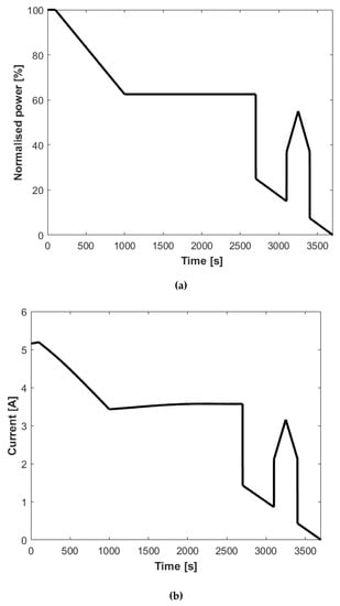 In this study, a typical power profile for the flight of a regional passenger airplane was used. This profile was taken from the work by Jux et al. []. The normalised power profile can be seen in Figure 6a. In light of the assumption made earlier that ECM parameters can be expressed in terms of SOC alone, the current profile can be calculated for this power profile. Because power, current, voltage, and SOC are all interrelated, an iterative calculation method was employed using the Goal Seek function in Microsoft Excel. In this calculation process, a condition was introduced to ensure that the SOC at the end of the flight was 0% (i.e., fully discharged state).