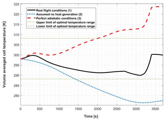 It is important to discuss the effects of heat loss and generation (cases (2) and (3), respectively) separately, as the power and ambient temperature profiles used in this work are for the general case (as described in Section 2.5), and the effect of one can outweigh that of the other depending on the type of flight. As can be seen in Figure 8, case (2) shows that when only the heat loss is considered the averaged battery temperature drops to nearly 273.15 K, which is below the lower limit of the optimal battery operating temperature range. This highlights the concerns raised regarding the cruise phase of any flight profile. When the power demand from the powertrain is low, there is little heat generation and the overall temperature is expected to drop due to the low ambient temperatures and high convection cooling coefficients. On the other hand, when only heat generation is taken into account (case 3), the temperature crosses the upper limit. These two cases highlight the fact that thermal control of the battery pack is necessary; it cannot be entirely insulated to create an adiabatic system. This justifies the purpose of the presented investigation of PCM-based BTMS usage cases, as a correctly designed BTMS using a PCM is able to provide insulation as well as offering a heat sink from the system to maintain an ideal operating window.