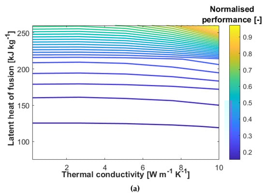 It can be observed from Figure 9a,b that increasing the thermal conductivity corresponds to improved performance of the BTMS. This is because heat is transformed across the battery pack, thereby removing the issue of the PCM partially melting near the cell surfaces. However, it is clear from Figure 9a that BTMS performance is far more sensitive to changes in the latent heat of fusion. Hence, it is logical to focus on the relationship between performance and latent heat of fusion.