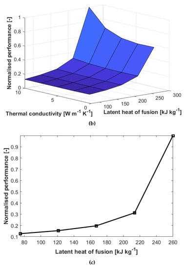 (a) Contour plot of normalised performance of BTMS against latent heat of fusion and thermal conductivity of PCM; (b) surface plot of normalised performance against latent heat of fusion and thermal conductivity of PCM; (c) graph of normalised performance against latent heat of fusion.