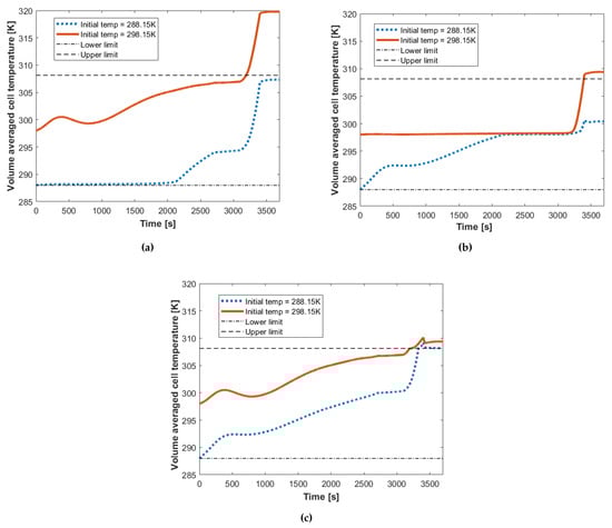Profiles of the average lithium-ion cell temperature throughout the progress of each modeled flight, where the initial temperature of the entire modeled domain (i.e., the battery pack including PCM and lithium-ion cells) is either 288.15 K or 298.15 K; (a) considers the case where the PCM melting temperature is 288.15 K, while (b) considers a melting temperature of 298.15 K and (c) considers a melting temperature of 308.15 K. The upper and lower limits refer to the optimal thermal conditions for the lithium-ion cells.