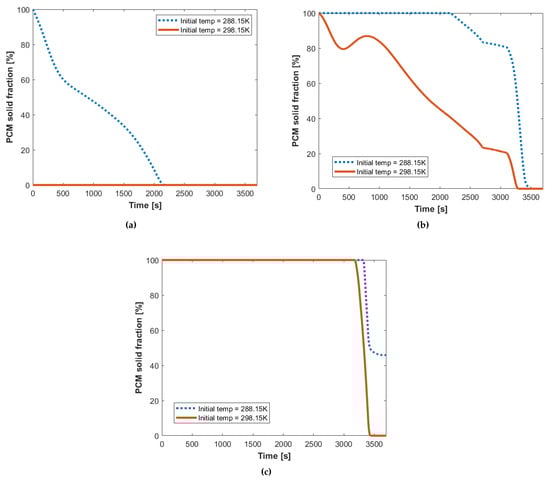 Profiles of the solid fraction of the PCM throughout the progress of each modeled flight, where the initial temperature of the entire modeled domain (i.e., battery pack including PCM and lithium-ion cells) is either 288.15 K or 298.15 K; (a) considers the case where the PCM melting temperature is 288.15 K, while (b) considers a melting temperature of 298.15 K and (c) considers a melting temperature of 308.15 K.