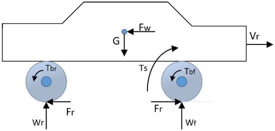 is the air resistance force, is the driving torque, are the braking torque of the front and rear wheels, are the ground friction of the ground acting on the front and rear wheels, are the vertical force of the front and rear wheels, is the driving force, is the braking force, and is the total resistance.