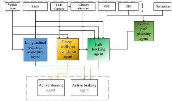 Longitudinal and lateral collision avoidance agents are taken into consideration to ensure the multi-agent coordinated control system deals with the traffic accident risk. Additionally, global path planning agents, path tracking agents, and actuator control agents are taken as fundamental agents in the system.