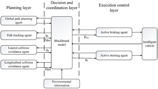 During the driving process, the information acquired by the environment perception layer is uploaded to the blackboard in real time, and each agent obtains information by interacting with the blackboard. When an obstacle appears on the default path, longitudinal and lateral collision avoidance agents are activated. The brake pressure and steering wheel angle are uploaded to the blackboard separately. If the two agents are activated at the same time, a choice must be made by the coordinated control module according to the actual situation.