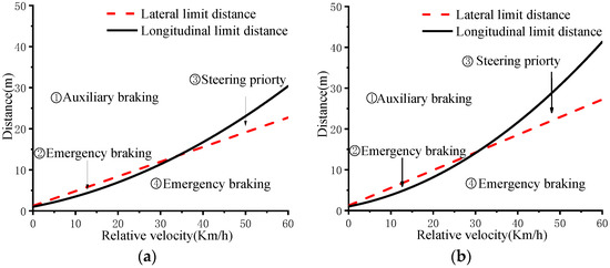 Longitudinal lateral collision avoidance agents are plotted in Figure 5a,b. The minimum safety distance required for emergency longitudinal collision avoidance is related to the square of the vehicle speed, and the minimum longitudinal safety distance required for emergency lateral collision avoidance is related to the square of the vehicle speed. When the vehicle speed is in the lower range, the collision avoidance distance required for longitudinal collision avoidance is small. With the increase in speed, the collision avoidance distance required for longitudinal collision avoidance increases rapidly, and the longitudinal collision avoidance distance required for lateral collision avoidance begins to be smaller than that for longitudinal collision avoidance. It can be seen that in area ① is greater than the longitudinal and lateral collision limit distance. In this case, the vehicle faces no risk and the auxiliary braking mode is adopted. At this time, more attention should be paid to the traffic efficiency and occupant comfort of the vehicle. The absolute value of the vehicle deceleration is limited to 4 m/s2 or less.