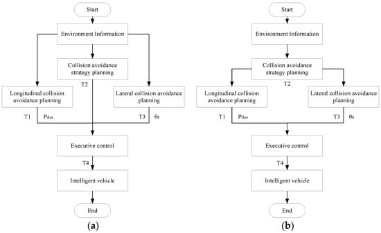 The active collision avoidance control strategy in this paper is shown in Figure 6a and the collision avoidance control strategy is shown in Figure 6b. is the planning time of longitudinal collision avoidance, is the decision time of collision avoidance way, is the planning time of lateral collision avoidance, is the execution control time.