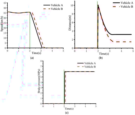 Simulation of longitudinal collision avoidance: (a) Vehicle speed; (b) Distance between vehicle and obstacle; (c) Brake pressure of the vehicles.