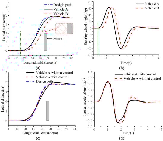 Results show that when the obstacle appears, the vehicle selects steering to avoid collision in this situation. The steering wheel angle output time of vehicle A is 0.14 s ahead of vehicle B as shown in Figure 9b. The critical collision time is calculated to be 1.09 s, the longitudinal displacement of vehicle A is 28.43 m, and the longitudinal displacement of vehicle B is 31.54 m. At this time, vehicle B collided with the obstacle, and vehicle A still has a certain distance from the obstacle. Figure 9a shows a close-up view of the collision with vehicle B. The timeliness and effectiveness of vehicle A’s lane-changing collision avoidance control have been verified, but its trajectory tracking performance has room for improvement. Therefore, as shown in Figure 9c,d, the fuzzy sliding control is adopted to ensure the good tracking performance of the vehicle on the lane-changing trajectory and the lateral acceleration curve of the vehicle is also more gradual, which meets the stability requirements of the vehicle. The fuzzy sliding control mainly acts on the turn-back stage of the vehicle’s emergency steering. As can be seen from Figure 9, the lateral acceleration of the vehicle decreases significantly after the vehicle quickly escapes from the danger of collision, which can ensure the stability of the vehicle and the comfort of the occupants.