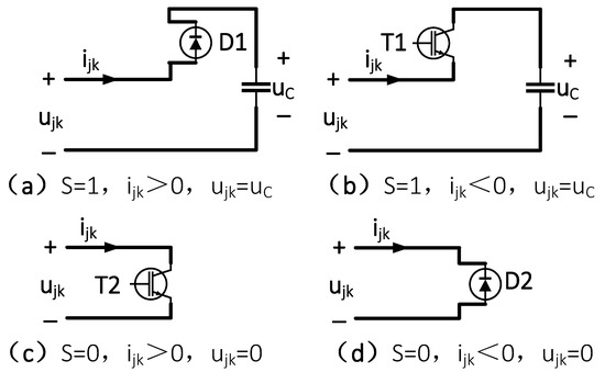 Working principle of an MMC half-bridge submodule. (a) Working condition in S = 1, ijk > 0. (b) Working condition in S = 1, ijk < 0. (c) Working condition in S = 0, ijk > 0. (d) Working condition in S = 0, ijk < 0.