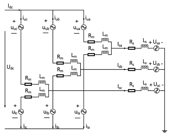 Based on the above assumptions, the upper and lower arm voltage of each phase could be equivalent to the AC voltage source , , and the upper and lower arm current could be represented by ,, as shown in Figure 4. Then, we built a three-phase equivalent circuit model of a typical MMC topology and performed an internal voltage and current analysis [17,18,19].