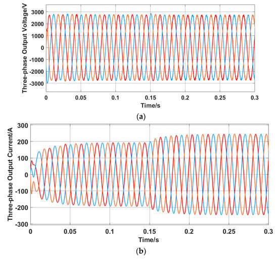 To verify the feasibility of the control strategy used in this paper, the main output quantities in the circuit could be observed so that the steady-state operation control effect of the overall MMC circuit could be observed [31]. The simulation was set to start from t = 0 s, and the active power disturbance was added on the AC side at t = 0.15 s during the simulation to verify the robustness of the circuit against the power fluctuation in the grid-connected operation. The three-phase voltages and currents are shown in their respective pictures using red, blue, and orange.