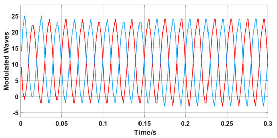 The modulation process is shown in Figure 10, which shows the modulation waves of the upper and lower bridge arms of phase a. It was observed as a step wave similar to the sine waveform with a high degree of symmetry.