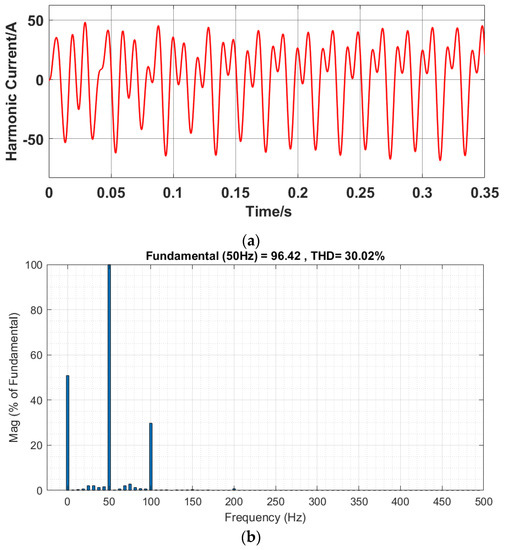 The controller, without adding the circulating current suppressor, is shown in Figure 11. The current waveform of the harmonic current component is shown in Figure 11a, and the THD of the arm current was 30.04%, as shown in Figure 11b.