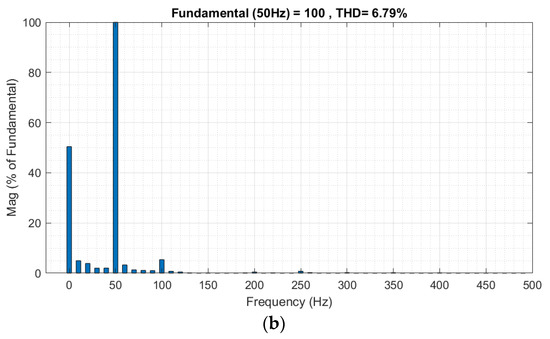 (a) FFT analysis of the three−phase output voltage. (b) FFT analysis of the three−phase output current.
