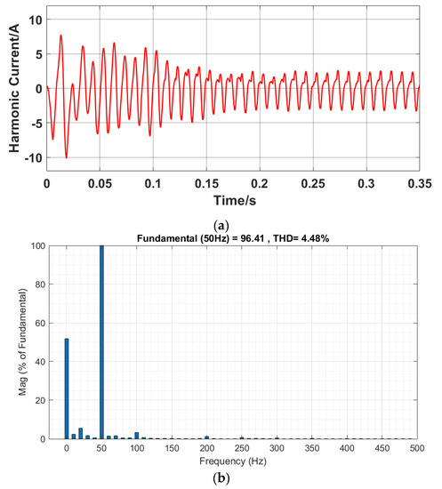 The case of using the PI control circulating current suppressor is shown in Figure 12. The harmonic current component waveform is shown in Figure 12a, and the THD of the arm current was 5.23%, as shown in Figure 12b.