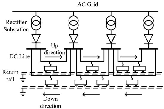 The DC traction network is the typical traction grid structure of a metro. The system consists of a grid AC bus and a supply DC bus, with the metro trains being supplied directly from the DC bus. As the metro usually contains two trains opposite each other, the metro’s DC traction power supply system consists of two parallel DC buses. Metro systems are typically supplied from the national electricity grid and use rectifier substations to convert AC voltage into 750, 1500, or 3000 V DC voltage to power the trains. Figure 1 shows the typical DC traction power network with multi-trains.