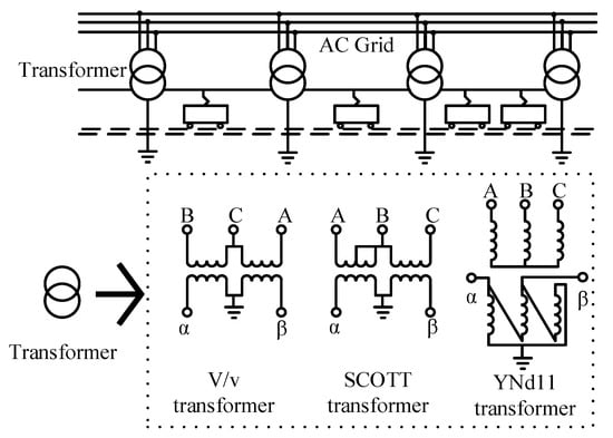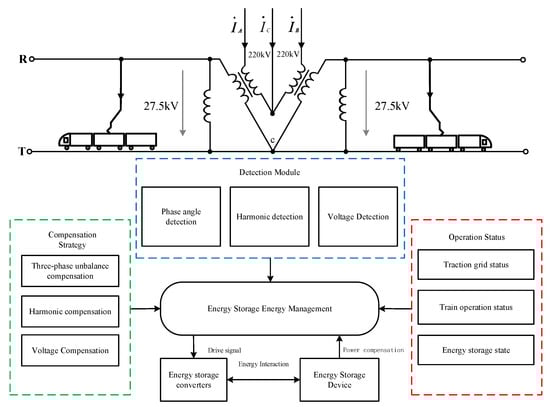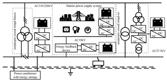 The energy storage system can be configured with the station power system or an energy feedback device in AC rail power supply systems such as Figure 4. AC rail transit substations can be divided into two types, same-phase power supply substations, and staggered-phase power supply substations [21,22,23,24]. In the same phase power supply substation, the role of the energy storage system is similar to that of the DC power supply system, which is mainly used to regulate power; in the wrong phase substation, the role of energy storage is mainly to balance the power between phases.