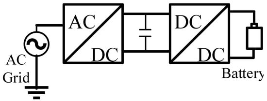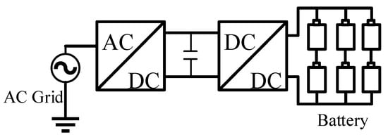 The battery is the most widely used energy storage unit, and to accommodate many different voltage levels, two-stage converters are the usual topology for battery applications. The two-stage converter consists of an AC/DC converter and a DC/DC converter. Depending on the type of AC grid, AC/DC converters are either three-phase or single-phase. The DC/DC converter is connected directly to the battery and regulates the charging current or voltage. As the battery needs to switch between charging and discharging modes, the DC/DC converter must have energy flowing in both directions. Bi-directional converters can be divided into non-isolated bi-directional converters and isolated bi-directional converters. The structural diagram of a two-stage converter is shown in Figure 5.