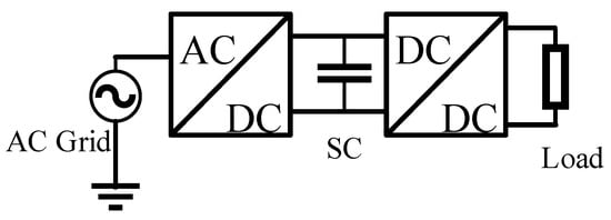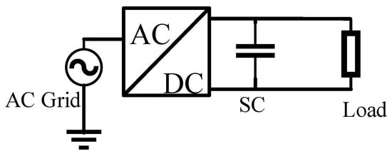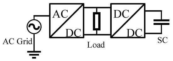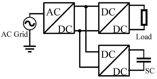 The supercapacitor’s need to support the DC bus voltage and energy storage in a direct retrofit bipolar bidirectional converter solution makes its control strategy complex such as Figure 17. The degree of loading can be simplified by swapping the position of the load and the supercapacitor in the topology. This topology corresponds to adding a DC/DC converter supercapacitor energy storage system to the load [38].