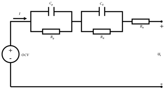 Accurate SOC estimation requires an accurate battery model, and the equivalent circuit model requires fewer parameters to be identified and is the most widely used in practical applications compared to electrochemical models. The second-order RC equivalent circuit model uses two RC networks to simulate the concentration polarization characteristics and electrochemical polarization characteristics inside the battery, respectively. It has higher accuracy compared with the first-order model and lower complexity compared with models that have more orders. Therefore, the second-order RC equivalent circuit model is selected in this paper for SOC estimation, as shown in Figure 1.